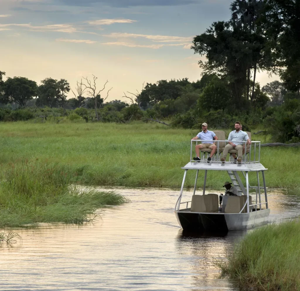 The Okavango Delta’s remarkable terrain includes marshland, deep watery channels, open plains and tall grasses. You’ll find that you’ll get more from land excursions versus water excursions depending on the season. When the water is high during the dry season, you’ll love our water-based excursions – involving mokoros, motorboats and double-decker boats. These excursions are unavailable during the wet season due to low water levels. Our land-based safaris can be enjoyed in the comfort of our custom-built 4×4 safari vehicles or on foot on a thrilling walking safari.